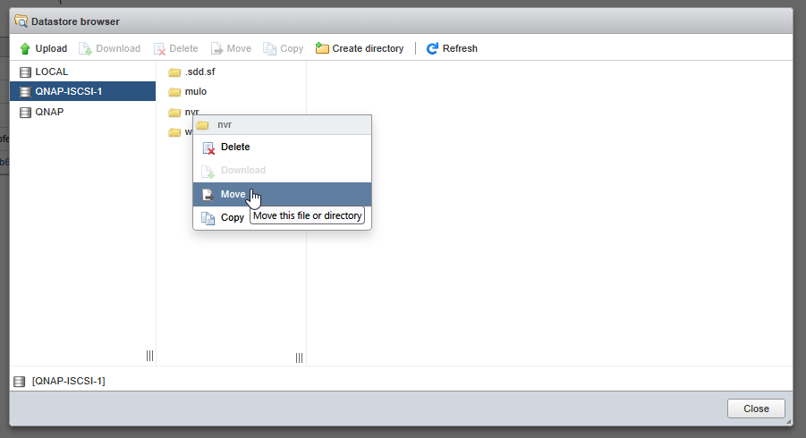 Bene, per “accellerare le operazioni” ed anche perché ESXi non ha la funzionalità di “spostamento di una VM” su disco, ne a freddo ne a caldo, ho deciso di fare browse nel VMFS e chiedere lo spostamento dell’intera folder della VM, dal volume NFS a quello VMFS perché avevo più spazio a disposizione per farlo.